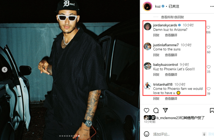 杜兰特和库兹马都是戴着黑色帽子,两人交流时库兹马面带笑容,KD的表情则十分耐人寻味;库兹马晒照更新动态,杜兰特、比尔等球员点赞,无数球迷招募库兹马加盟太阳,还有球迷表示他刚好可以和比尔一起来到菲尼克斯。
