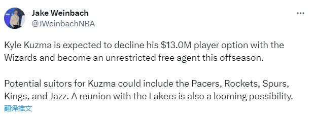 预计库兹马将拒绝执行1300万美元的球员选项,将成为完全自由球员。