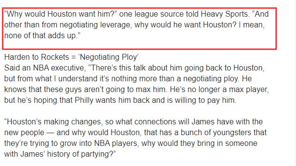 美媒Heavy Sports报道,消息人士表示,为什么休斯顿会想要哈登?除了谈判筹码,他为什么要重返火箭?我的意思是,这些都不成立。