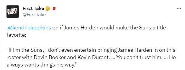 除了火箭之外,美记爆料太阳有意追求哈登,对此名嘴帕金森在节目中表示:如果我是太阳队,我甚至不会考虑让哈登与布克和杜兰特一起进入这个名单,你不能相信他,他总是想按自己的方式行事。