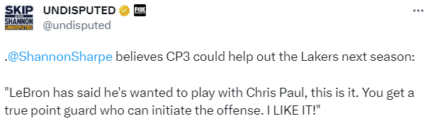 名嘴香农-夏普(詹姆斯的好友)表示:勒布朗说过他想和克里斯-保罗一起打球,就是这样。你得到了一个真正的控球后卫,他可以发起进攻,我喜欢他们联手。
