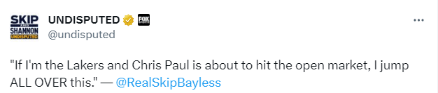名嘴斯基普-贝勒斯表示:如果我是湖人队,当保罗进入自由球员市场后,我会全力以赴争夺他。