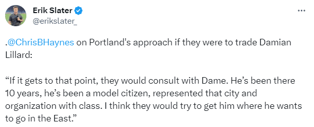 海耶斯在节目中表示:我和利拉德很频繁地在沟通,他也同意他现在面临着一个十字路口,开拓者有3号签,利拉德想要现在就能赢球。他想要竞争冠军,他不认为保留这个3号签对球队在当下赢球有帮助;如果我是利拉德,开拓者要是保留3号签,不管是选择亨德森还是其他任何新秀,我都可能选择与球队分道扬镳。