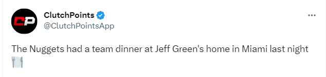 掘金全队在杰夫-格林的迈阿密家中聚餐,美媒Clutch Points晒出掘金众人合影,杰夫-格林、约基奇、小乔丹和晚餐名厨一起合影,格林还和小布朗、穆雷、主帅马龙等人合影,全队开心共进晚餐,进一步打造球队的凝聚力。