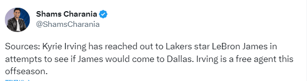 据名记Chris Haynes报道,欧文希望独行侠能交易得到詹姆斯,与他和东契奇组成超级三巨头;名记Shams跟进报道,欧文已经联系了詹姆斯,他想知道詹姆斯是否会来达拉斯,来为独行侠效力。