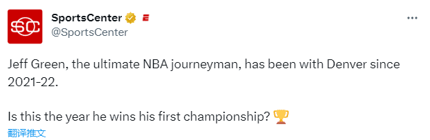 2021年,格林和掘金达成2年1000万美元合同,今年他随队杀进总决赛,掘金是格林职业生涯效力的第11支球队。