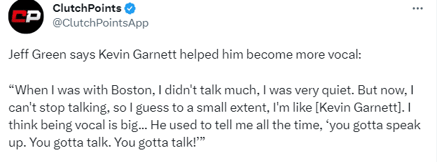 现在格林是掘金更衣室老大哥,戈登表示格林在掘金更衣室的价值是无价的;谈及自身的变化,格林感谢绿军名宿加内特,表示:当我在波士顿的时候,我话不多,我很安静。但现在,我无法停止说话,所以我猜在某种程度上,我就像凯文-加内特,我认为发声很重要……他过去常常告诉我,‘你要大声说出来。你得谈谈你得说话!