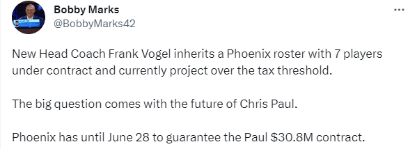 Bobby Mark还表示保罗是太阳今夏面临的最大问题,太阳队只有七名球员的合同,但他们将面临巨额奢侈税,仅布克、杜兰特、艾顿和保罗的薪水加起来的收入占太阳队1.64亿美元保障工资的87%。