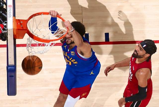 双方首发在身材上有着很大的差距,掘金方面约基奇、戈登和小波特都超过2米05,而热火除了阿德巴约之外,没有身高超过2米02的。开场双方试探之后,掘金便立刻占据优势。首节比赛,掘金便领先9分。场面上掘金完全控制了比赛,热火显得毫无办法。第二节末段,掘金打出了一波16-7的攻击波,半场结束分差来到了17分。