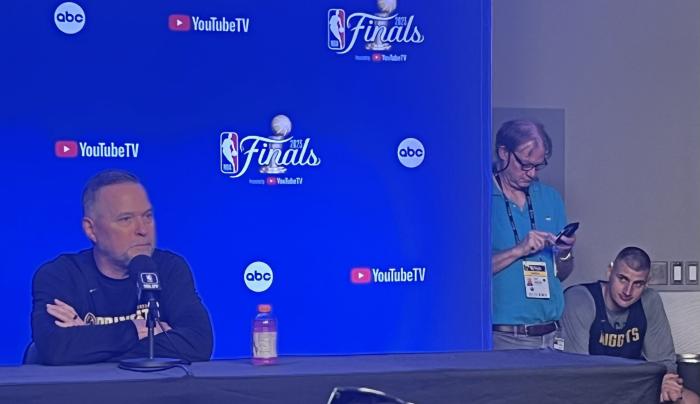 掘金备战总决赛现场曝光:约基奇搞怪犹如活宝 坐角落偷看主帅太抢镜