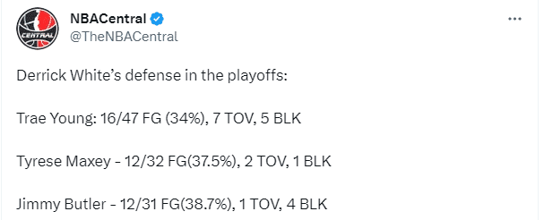 东决系列赛6场比赛,巴特勒被怀特防住了,G6面对怀特6投0中还惨遭大帽,东决系列赛面对怀特31投12中,投篮命中率仅仅只有38.7%,还被帽4次。