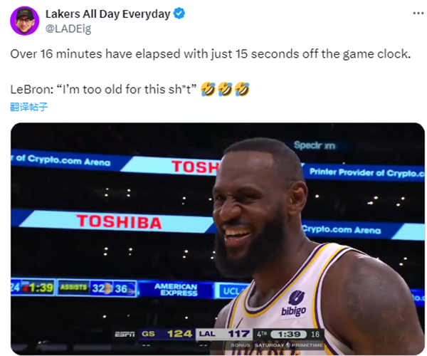 最后1分35秒,湖人和勇士在没有24秒计时的情况下继续比赛,詹姆斯运球被库里抢断,一番对战,最终湖人121-128不敌勇士。