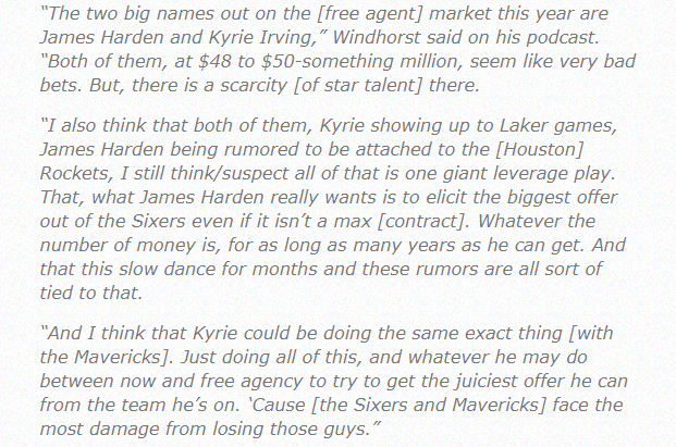Brian Windhorst在节目中表示:今年自由球员市场上的两个大人物是詹姆斯-哈登和凯里-欧文,他们两人的身价都在4800万至5000万美元之间,看起来都是非常糟糕的赌注。但是他们是(明星人才)稀缺的明星人才。