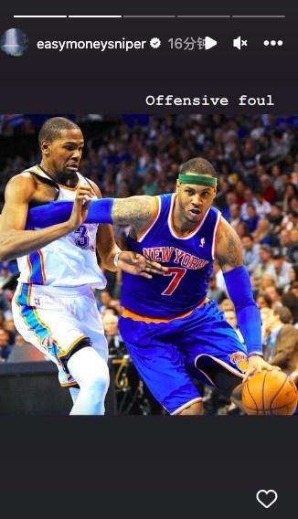 太阳球星杜兰特更新INS晒出多张与安东尼的同框照,其中一张(如配图)配文:“进攻犯规”。