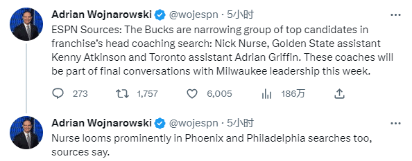 据ESPN名记woj报道,从刚开始多达15人的新帅候选名单,雄鹿队已经把教练人选的范围缩小为前猛龙主帅纳斯、勇士助教阿特金森以及猛龙助教阿德里安-格里芬,他们本周将会和雄鹿高层进行最后的对话。