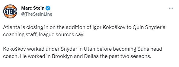 据名记Marc Stein报道,前太阳主帅伊戈尔-科科什科夫接近加入老鹰教练组,他曾在斯奈德手下工作;另外据报道,如果前湖人主帅沃格尔考虑下赛季的助理教练职位,独行侠被认为是最有希望得到他的球队。