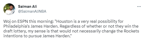 woj还表示无论火箭是否抽到状元签,这都不会改变他们追求哈登的意图。