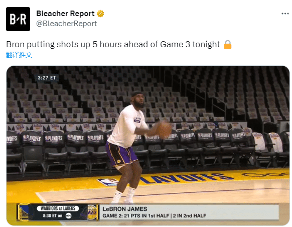 詹姆斯提前5个小时来到球馆备战G3,表明全力争夺拿下第三场的决心,此前湖人首轮G6对阵灰熊前,詹姆斯曾这样做过,最终湖人G6主场40分大胜灰熊,4-2创造黑七奇迹。
