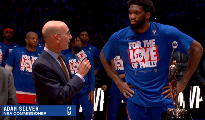 在76人和凯尔特人G3赛前,恩比德正式捧起属于他迈克尔-乔丹奖,NBA总裁亚当-萧华来到费城,亲自为他颁奖;现场球迷集体为他高呼MVP。
