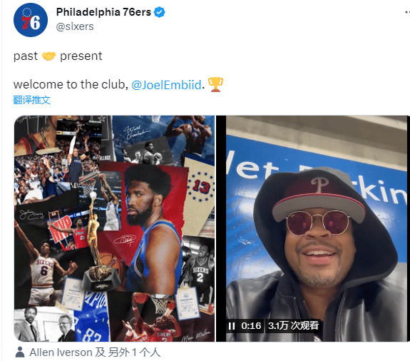 76人官方晒出爱艾弗森等名宿祝贺恩比德,欢迎他加入球队队史MVP俱乐部。