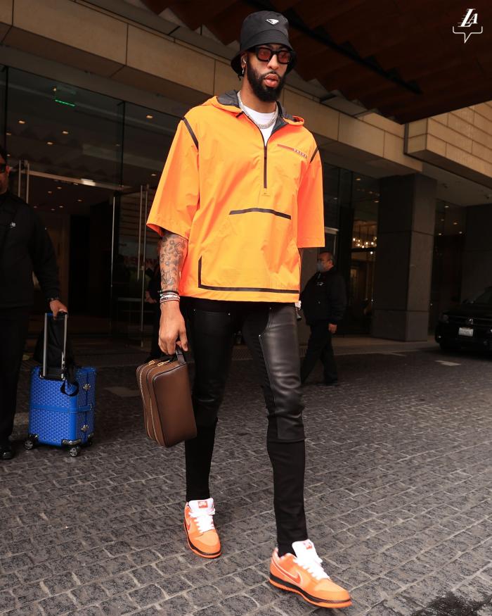 詹姆斯身穿白色长裤、戴着棒球帽,坐在球队大巴时紧盯着笔记本的屏幕,一脸专注十分严肃;浓眉则身穿橙红色上衣和黑色紧身裤,显得十分帅气;拉塞尔、里夫斯都穿得十分休闲,湖人众将乘坐大巴抵达勇士主场,然后走进球馆。