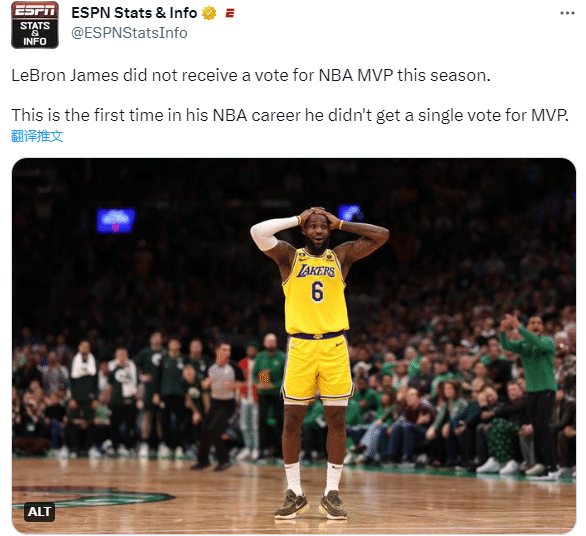 湖人球星勒布朗-詹姆斯职业生涯首次没有获得MVP选票,38岁老詹扎心了。