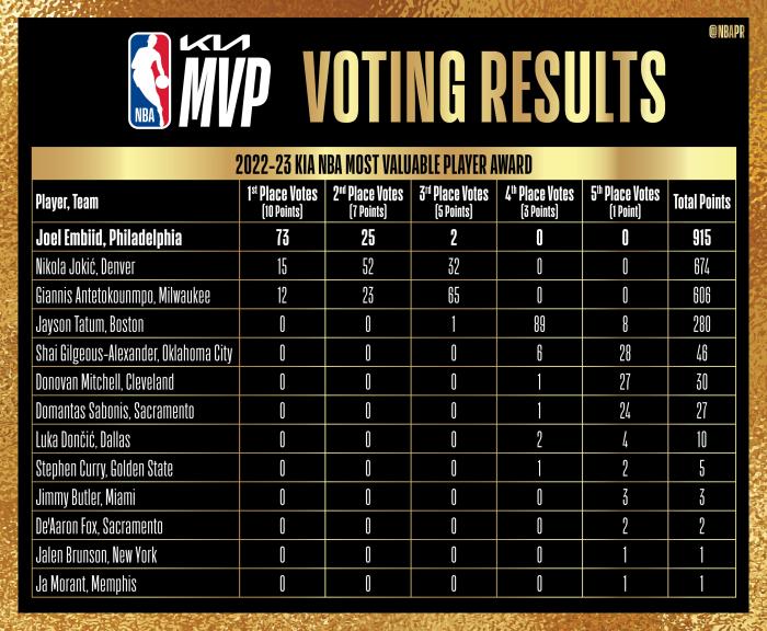 在MVP投票结果中,恩比德获得73张第一选票、25张第二选票和2张第三选票,总共915分;约基奇15张第一选票,总得分674分,字母哥12张第一选票,总共606分;恩比德完胜约基奇和字母哥,915分联盟第一。