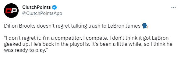 在赛季总结会上,狄龙谈到挑衅詹姆斯的争议话题,表示:我不后悔,我是个竞争者,我就是竞争,我不认为这些垃圾话刺激了詹姆斯,让他进入季后赛状态。季后赛已经开始一段时间了,所以我认为他已经准备好打球了。总的来说,我们只是被一支更好的球队击败了,一支强大的球队,他们的阵容齐整,所有人都健康。