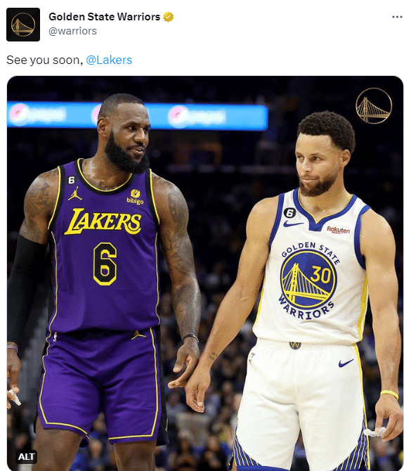 勇士晋级后湖人官方连续发推宣战,现在勇士官方已经应战,先是晒出詹库同框的赛场照,配文写道:很快见,湖人队;勇士官推还写道湾区大战洛杉矶。