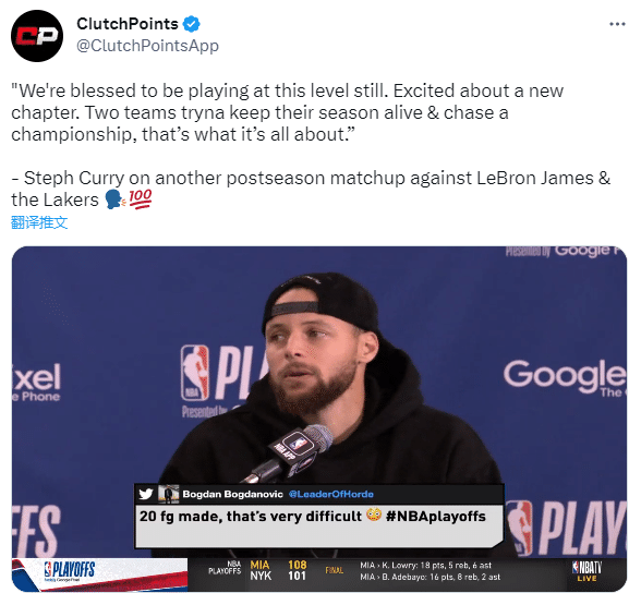 勇士晋级赛后,库里谈到半决赛大战湖人和詹姆斯,表示:我们很幸运仍能在这个水平上对决,对新的篇章感到兴奋。两支球队试图延续他们的赛季并追逐总冠军,这就是它全部的意义所在。
