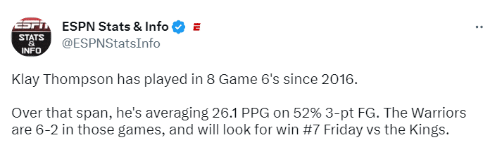 这场比赛开打前,美媒就疯狂提及G6汤。ESPN数据显示,自从2016年以来,汤普森已经8次出战系列赛第6场,他场均能得到26.1分,三分命中率52%。这8场比赛,勇士6胜2负。