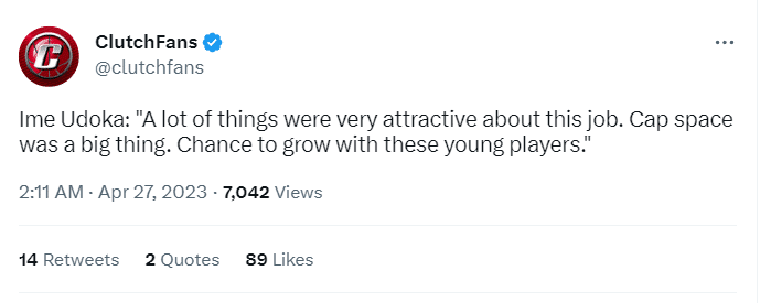在谈到为何选择来火箭执教时,乌度卡说道:“这份工作有很多吸引人的地方。薪金空间是个很大的吸引点,并且能够有机会和这些年轻球员们一起成长。”谈到队内的阵容名单时,乌度卡说道:“当我深入研究比赛录像时,真的让我大开眼界。”