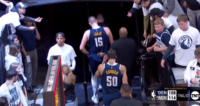 加时赛,唐斯早早六犯毕业,沃克连续两记底角三分,约基奇关键时刻继续带队保持悬念,爱德华兹关键三分终结悬念,约基奇续命三分打铁,最终掘金逆转失败,无缘横扫晋级。赛后,约基奇沮丧离场,发力一战仍惜败,未能客场终结系列赛,但G5有望主场拿下首轮。