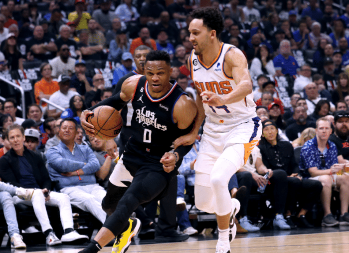 太阳第一节23-30落后7分,次节25-17反超比分,半场打完两队仅相差1分,杜兰特半场9中3拿到14分6篮板3助攻,轰进追身三分,突破威少急停干拔;反观快船队,威少单核带队,半场拿到13分4篮板2助攻,持球突破杀到禁区单臂劈扣太疯狂。