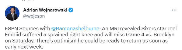据名记Woj报道,76人球星恩比德接受了核磁共振检查,因右膝扭伤缺席首轮G4客战篮网的比赛;乐观估计,恩比德最早可能会在下周初回归。