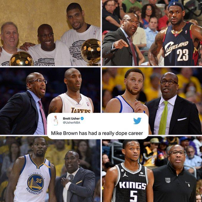 ESPN官方晒出了迈克-布朗执教生涯的部分履历——2003年,迈克-布朗作为助教,随马刺获得NBA总冠军;2005年,布朗成为骑士主教练,执教勒布朗-詹姆斯;2011年迈克-布朗成为湖人主教练,执教科比-布莱恩特;2016年,迈克-布朗成为科尔的助教,执教库里和杜兰特,6年助教随勇士获得了3次总冠军;2022年,迈克-布朗成为国王主教练,率领国王在时隔17年后打进季后赛。