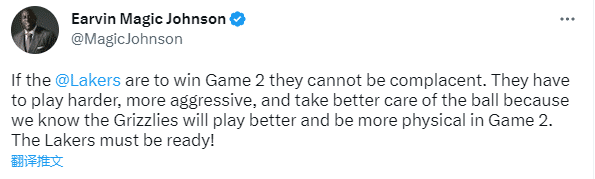 湖人如何才能拿下G2?湖人名宿魔术师约翰逊发推支招:如果湖人想要赢下G2,那他们一定不能自满。他们必须打得更努力,更有侵略性,还得更好地看好球,因为我们都知道灰熊第二场将会打得更好,身体对抗也会更强硬。湖人必须做好准备。