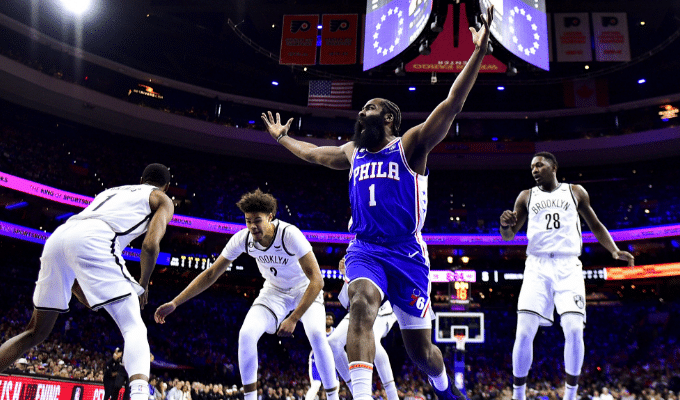 哈登低迷!76人陷绝境,半场落后篮网5分,约翰逊隔扣大帝创纪录