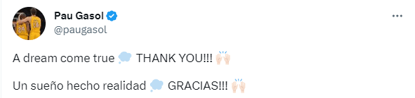 加索尔发推:梦想成真,感谢!