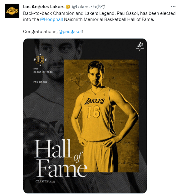 湖人官方祝贺加索尔,恭喜两届总冠军和湖人传奇入选名人堂,他的球衣永远悬挂在了球馆上空,现在他又迈向了名人堂;公牛和马刺官方也祝贺加索尔。