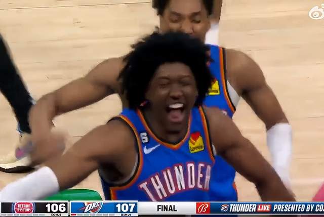 由于活塞此时已经没有暂停,活塞搏命的后场三分也未能命中,雷霆最终1分优势赢下比赛。此时,杰伦威廉姆斯非常激动,他在观众面前振臂高呼激情怒吼,庆祝这场比赛的胜利。而队友们则纷纷围上来,向他表示祝贺。而现场的雷霆主场球迷,也兴奋异常,纷纷起立鼓掌欢呼。