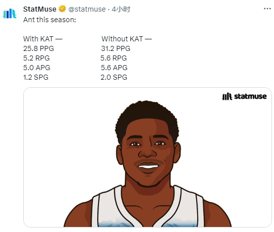 赛季至今,22岁的爱德华兹出战62场,场均拿到26.3分5.2篮板5助攻1.3抢断,据统计,本赛季唐斯休战时,爱德华兹场均能够轰下31.2分5.6篮板5.6助攻2抢断。