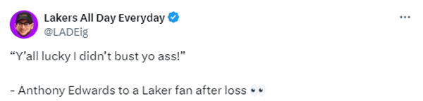 赛后爱德华兹不满判罚,直言当对方一人罚球数超过我们全队时,这太艰难了,每次对方拿到球,我们就被吹犯规;在湖人球馆外,爱德华兹对着湖人球迷表示:你们真幸运,我们没有打爆你们。