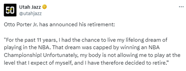 小奥托-波特宣布退役,发表退役声明:在过去的 11 年里,我有机会实现在 NBA 打球的毕生梦想。这个梦想因赢得NBA总冠军而圆满!不幸的是,我的身体已经不再允许我在期望的水平上打球,因此,我决定退役。