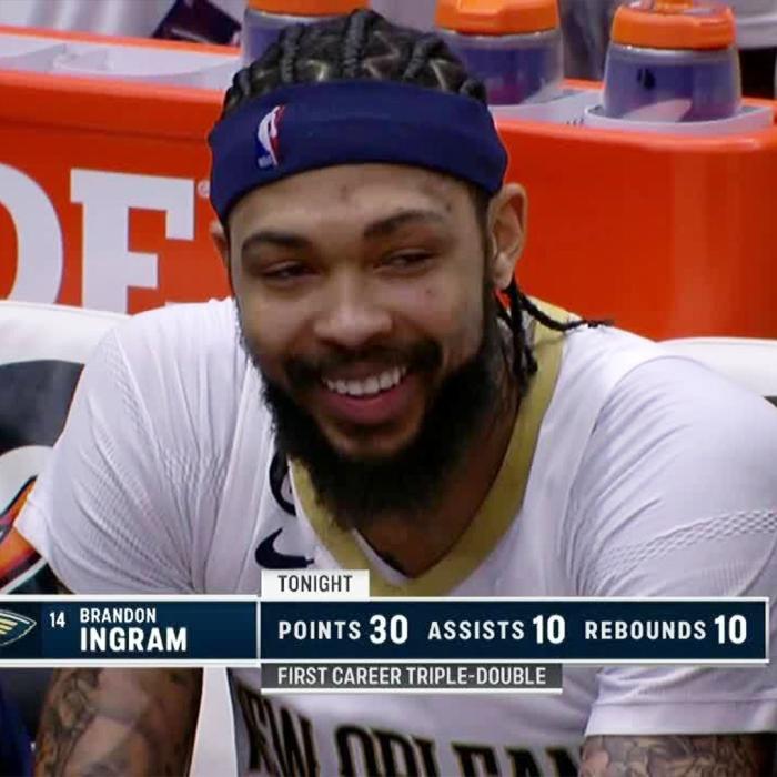 下半场,英格拉姆第三节8投4中又拿到11分,并且篮板和助攻都上双,三节没打完就轰下30+三双,镜头拍到莺歌咧嘴大笑十分开心;末节鹈鹕20-4一波流领先到23分,英格拉姆上场打了一会后提前打卡下班,2分12秒下场休息,锡安全程坐在替补席观战。