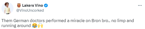 詹姆斯蹦蹦跳跳离开球馆,相信湖人能够重返季后赛,也说明他本人表态本赛季会回归为湖人出战;自从2月27日不幸遭遇右脚肌腱损伤以来,詹姆斯已经养伤22天,据报道,老詹前往德国接受了富血小板血浆注射治疗,旨在早日重返赛场。