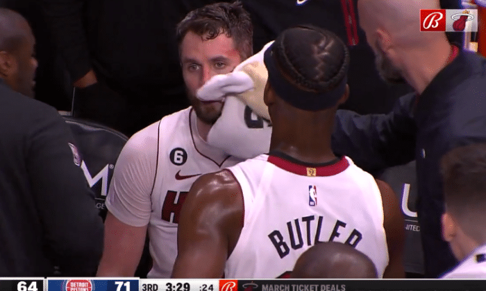 第三节3分29秒,乐福进攻时不幸受伤,当时的情况是巴特勒推倒了麦格鲁德,后者撞到空中的杜伦,杜伦下落时下巴磕到了乐福的头,最终,裁判吹罚巴特勒进攻犯规;杜伦则捂着下巴蹲在地板上,乐福捂着头部,头部被磕破,之后坐回替补席,鲜血染红球衣,队医赶紧用毛巾为乐福擦血以及止血,巴特勒过来问候乐福的伤势,之后他返回更衣室接受治疗。