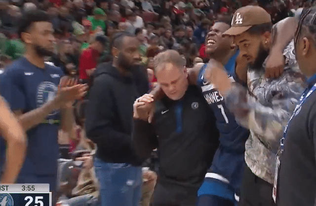 本场比赛进行到第一节4分钟左右,爱德华兹从后场运球后在弧顶发起挡拆进攻,面对双人包夹,爱德华兹跳起传给远端队友,队友稳稳命中三分。但爱德华兹自己却在落地时不慎崴脚。从慢动作来看,爱德华兹落地时没有和对手接触,纯属意外。但他的右脚反关节受力,情况相当不妙。爱德华兹随后痛苦倒地,不断发出惨叫并且捶击地板,并且连续喊出暂停、暂停。