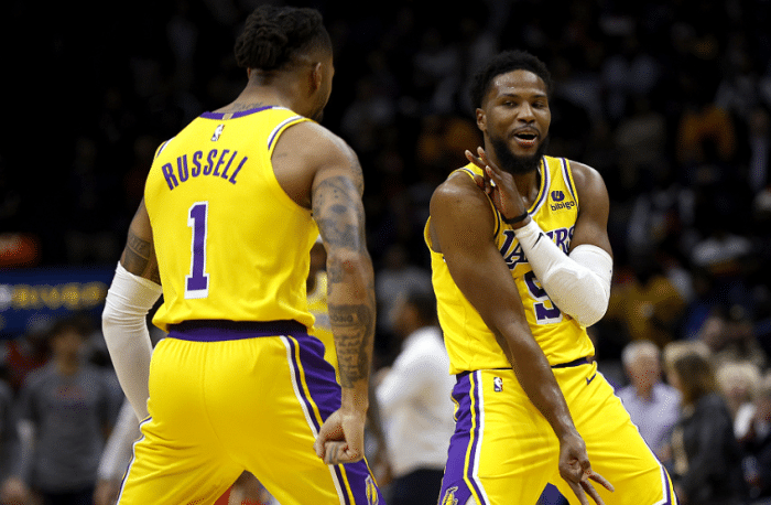 今日一战, 浓眉开场连得8分,再加上比斯利和拉塞尔输送三分,湖人14-0梦幻开局,詹姆斯兴奋地和拉塞尔激情庆祝,之后湖人外线火力不减,全队单节命中9记三分,首节39-24领先鹈鹕15分。