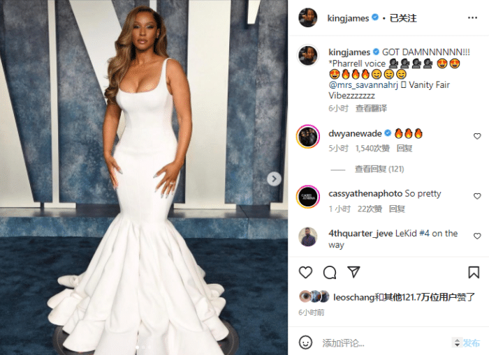 詹姆斯还在社交媒体上晒出萨瓦娜身穿性感长裙参加派对的美照,直言萨瓦娜太美了,韦德在评论区留言:太火了。